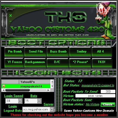 12:09 PG Edit This 0 Comments »Yahoo Customs 420 mempunyai 10 options serangan dan anda boleh melogin sebanyak 1000bots! Ia juga mempunyai fugsi seperti online checker unuk membolehkan anda mengetahui status mangsa.